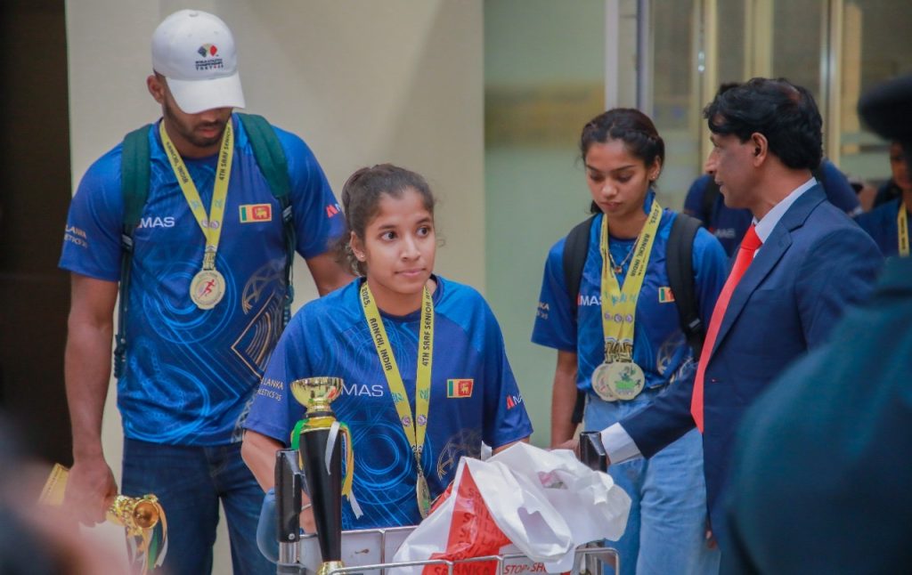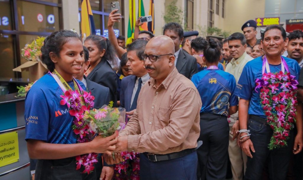 දිවයිනට පැමිණි ශ්රී ලංකා මලල ක්රීඩා කණ්ඩායම හරසරින් යුතුව පිළිගනු ලැබුවේය.
