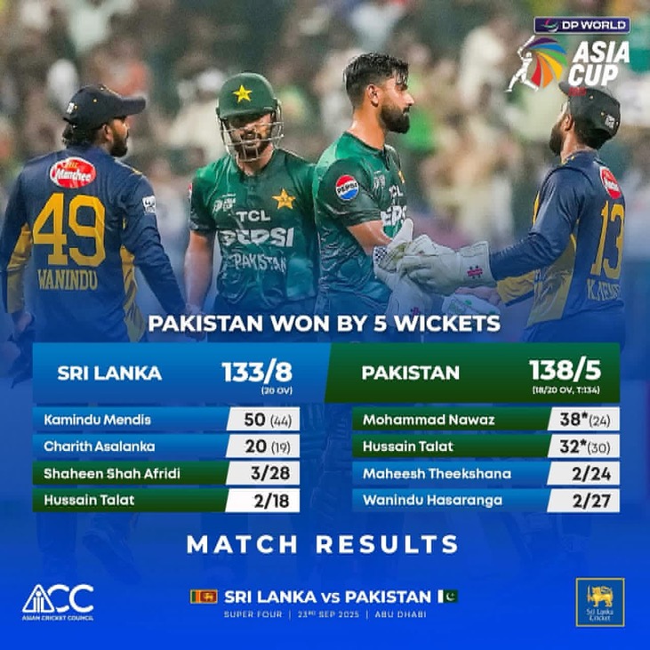 ආසියානු කුසලාන T20 තරගාවලියේ සුපර් 4 තරග වටයේ පාකිස්ථානය හා සමග තරගය ශ්රී ලංකා කණ්ඩායම කඩුලු 5කින් පරාජය විය.