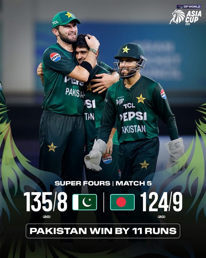බංග්ලාදේශ කණ්ඩායම ලකුණු 11කින් පරාජය කර ආසියානු කුසලාන T20 ක්රිකට් තරගාවලියේ අවසන් මහා තරගයට සුදුසුකම් ලබාගැනීමට පාකිස්ථාන කණ්ඩායම සමත් විය.