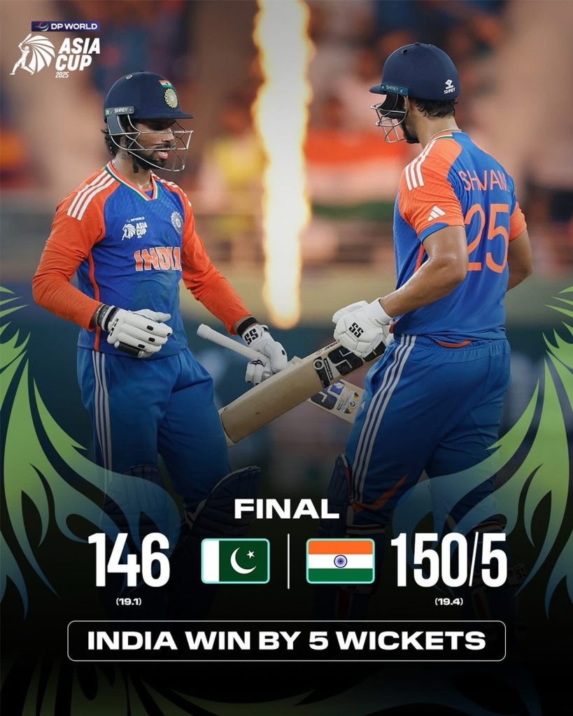 ආසියානු කුසලාන T20 තරගාවලියේ අවසන් තරගයේදී පාකිස්ථානයට කඩුලු 5කින් පරාජය කළ ඉන්දියාව 9 වන වරටත් ආසියානු ක්‍රිකට් ශූරතාව දිනා ගත්තේය.