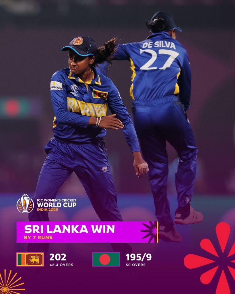 කාන්තා එක්දින ක්‍රිකට් ලෝක කුසලාන තරගාවලියේ බංග්ලාදේශය සමග තරගය ලකුණු 7කින් ජය ගැනීමට ශ්‍රී ලංකා ක්‍රීඩිකාවෝ සමත් විය.