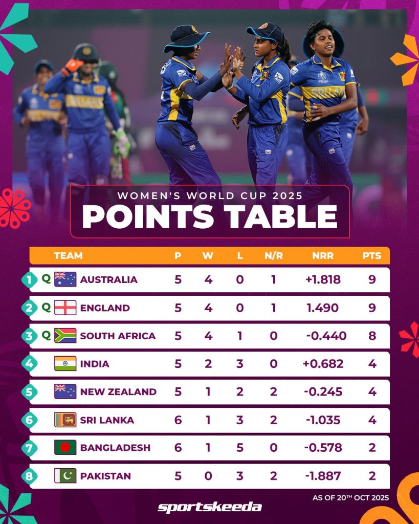 ශ්‍රී ලංකාව ප්‍රසාද ලකුණු 4ක් සමග සටහනේ 6 වන තැන පසුවන අතර ඔවුන්ට අවසන් පූර්ව වටයට පිවිසීමට නම් පාකිස්ථාන තරගය ජය ගත යුතුවෙයි.