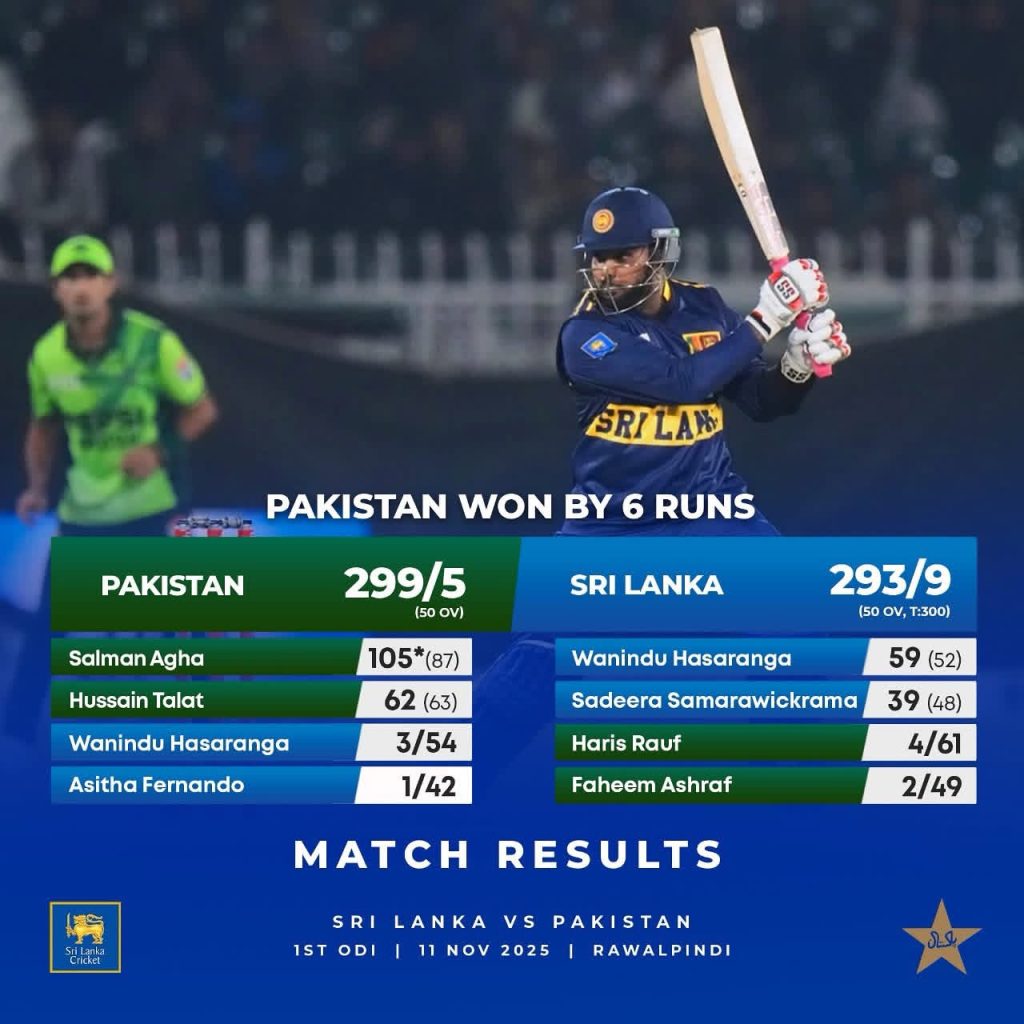ශ්රී ලංකාව හා පාකිස්ථානය අතර පැවැතුණු පළමු එක්දින ක්රිකට් තරගය ලකුණු 6කින් ජය ගැනීමට පාකිස්ථාන කණ්ඩායම සමත් විය.
