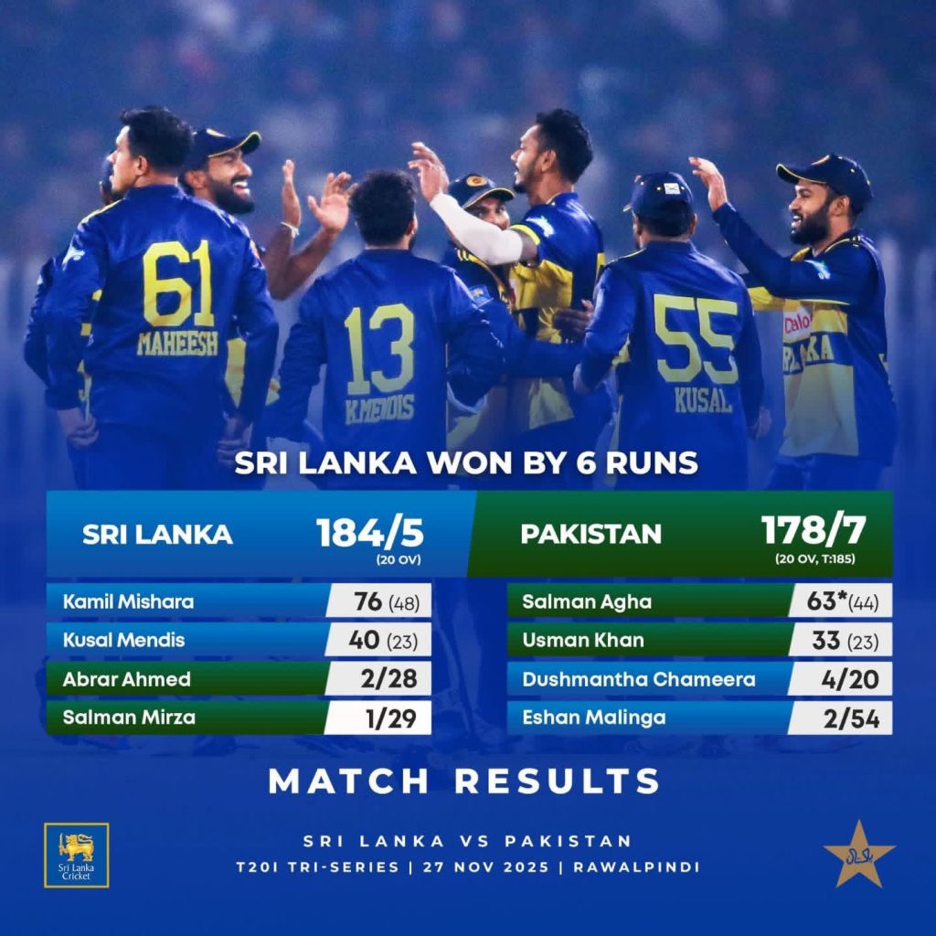 පාකිස්ථානයේදී පැවැත්වෙන තුන්කොන් T20 තරගාවලියේ අවසන් තරගයට සුදුසුකම් ලැබීමට ශ්රී ලංකා කණ්ඩායමට හැකියාව ලැබුණේ පාකිස්ථානය හා තරගය ලකුණු 6කින් ජය ගනිමින්ය.