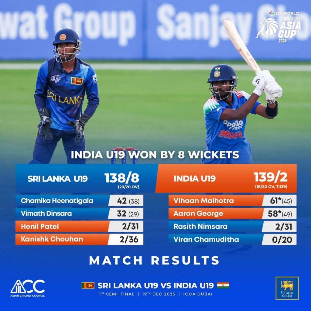 ඉන්දියාව සහ පාකිස්ථානය වයස 19න් පහළ ආසියානු කුසලානයේ අවසන් තරගයට සුදුසුකම් ලබා ගත්තේය.