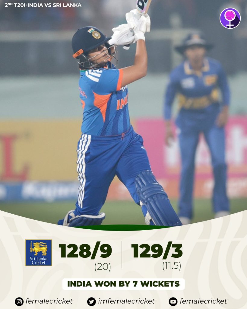 ඉන්දියා කාන්තා කණ්ඩායම පන්දුවාර 11.5කදී කඩුලු 3කට ලකුණු 129ක් ලබා තරගය ජය ගත්හ.