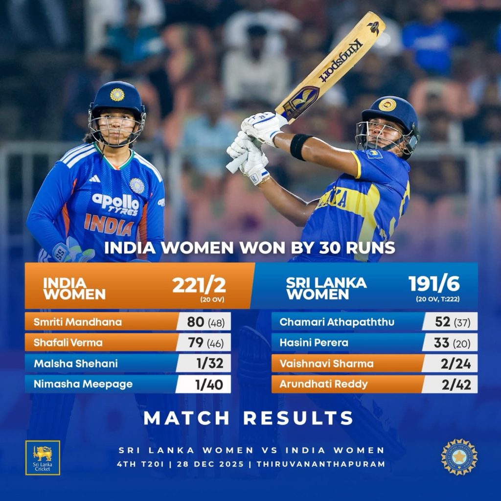 ශ්රී ලංකා කාන්තා කණ්ඩායම හා ඉන්දියා කාන්තා කණ්ඩායම අතර 4වන T 20 තරගය ලකුණු 30කින් ශ්රී ලංකා කාන්තා කණ්ඩායම පරාජය විය.