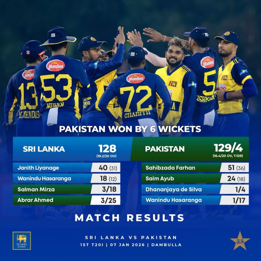 ශ්රී ලංකා කණ්ඩායම ලබාදුන් ලකුණු 129ක පහසු ඉලක්කය කඩුලු 4ක් දැවී තිබියදී පන්දුවාර 16.4කදී කඩුලු 4ක් දැවී පසුකර යෑමට පාකිස්ථාන කණ්ඩායම සමත් වුණා.