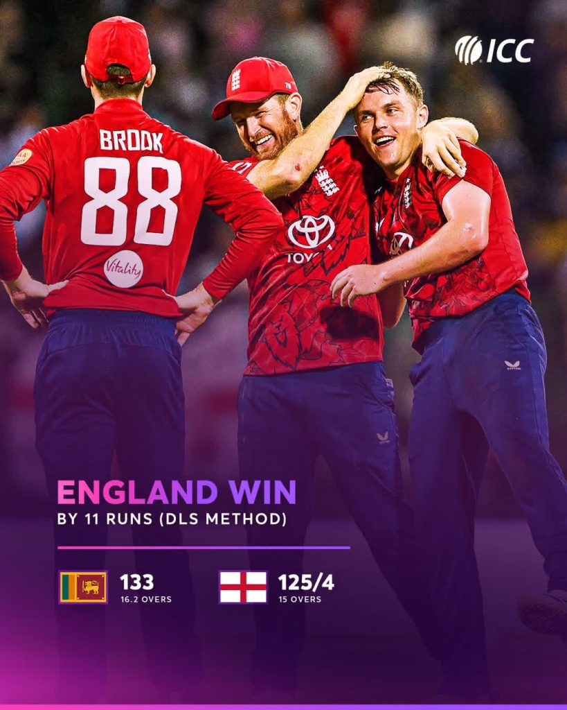 ශ්රී ලංකාව සහ සංචාරක එංගලන්ත කණ්ඩායම හා පැවැතුණු පළමු T 20 තරගයෙන් එංගලන්ත කණ්ඩායම ඩක්වත් ලුවිස් න්යායට අනුව ලකුණු 11කින් ජය ගන්නට සමත් විය.