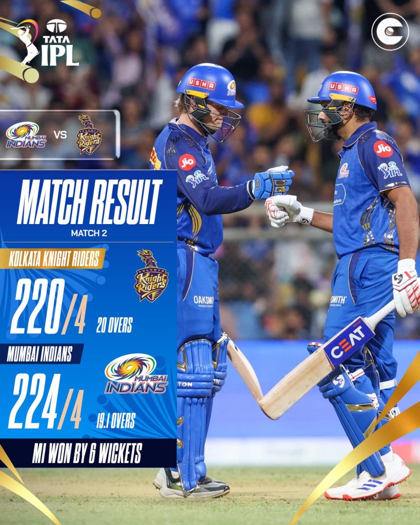 2026 IPL තරගාවලියේ පැවැති පළමු තරගය දෙක ජය ගන්නට රෝයල් චැලෙන්ජර්ස් බැංගලූරු කණ්ඩායම හා මුම්බායි ඉන්දියන්ස් කණ්ඩායම සමත් විය.